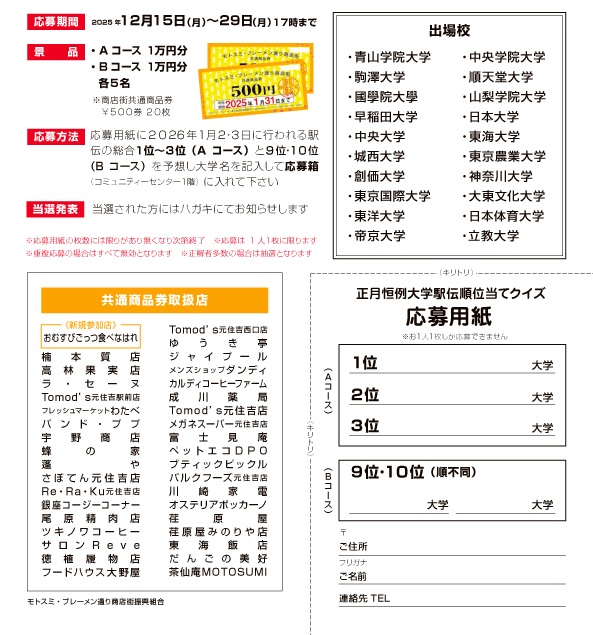 モトスミ・ブレーメン通り商店街では、毎年恒例の【大学駅伝順位当てクイズ】が行われています。